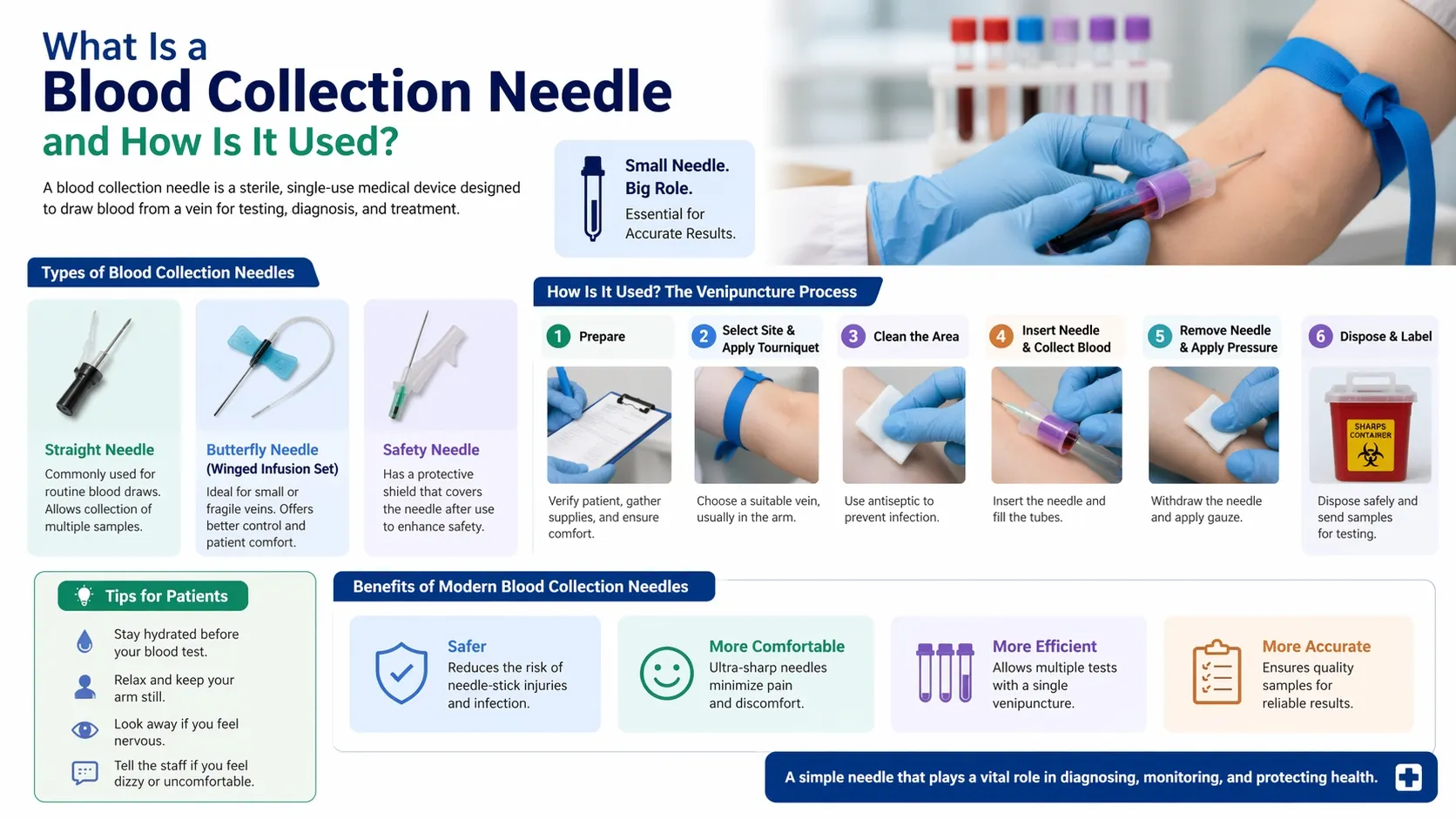 Diagnostic testing is important in the modern healthcare environment to detect, monitor, and prevent diseases. Blood collection is one of the most frequently practiced processes in clinics, hospitals and laboratories. The key element of this process is a small but necessary medical device, a blood collection needle. Knowledge about its nature, functioning and its application can make healthcare providers and patients feel more knowledgeable and comfortable about the process.